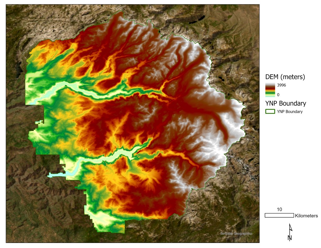 A Digital Elevation Model (DEM) was sourced from the USGS TNM Downloader and resulted in 72, 10000×10000 meter raster files. I used the Mosaic to New Raster tool to create a compiled raster of the 72 individual layers and then used clip raster to the bounds of the park.