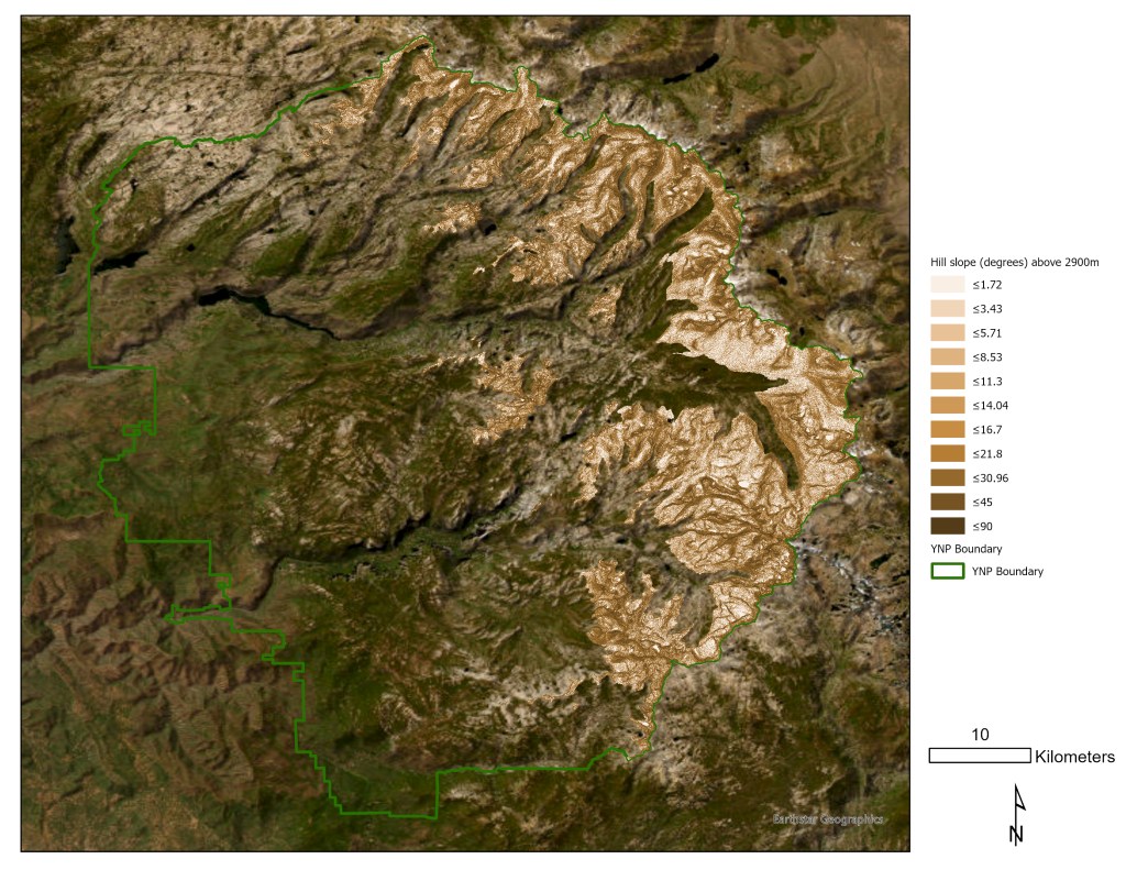 The final piece of this puzzle was to define habitat by slope. Slope was calculated from a truncated DEM that only includes sites above 2900m. Using the Slope tool, cells were defined by their slope in degrees.
