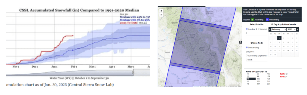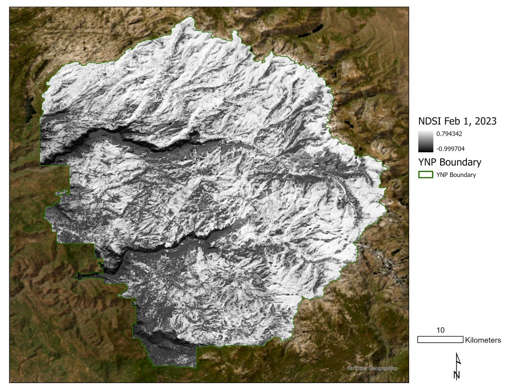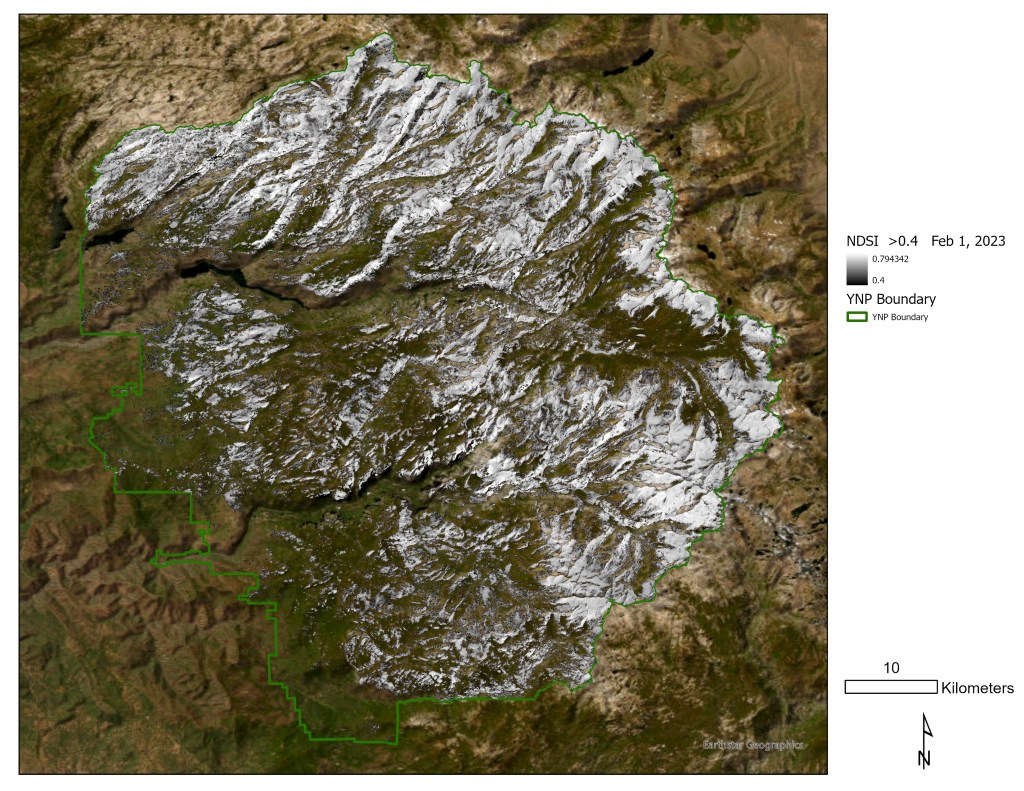 The next step in the puzzle was identifying areas with log-term snowpack. I downloaded LANDSAT 9 data from USGS across two dates, Feb. 1, 2023 (the day the Sierra Nevada accumulated an average year’s snowpack) and June 9, 2023 (a date when Rosy-finches are active in the alpine and using cliffs and snowfields).