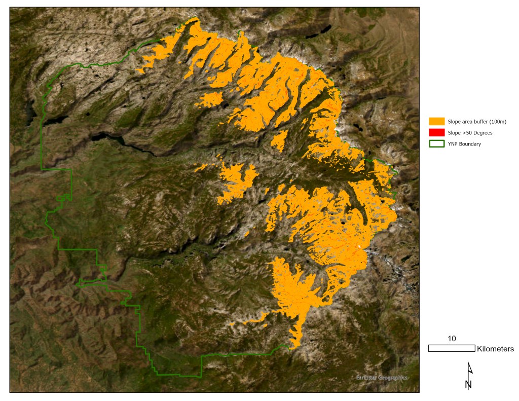 Data for this project was sourced from USGS’s Earth Explorer, TNM Downloader, and National Park Service. To complete this habitat assessment, I used raster mosaic, clip raster, intersect, raster calculator, extract by attributes, DEM slope, and raster/vector conversion tools.
